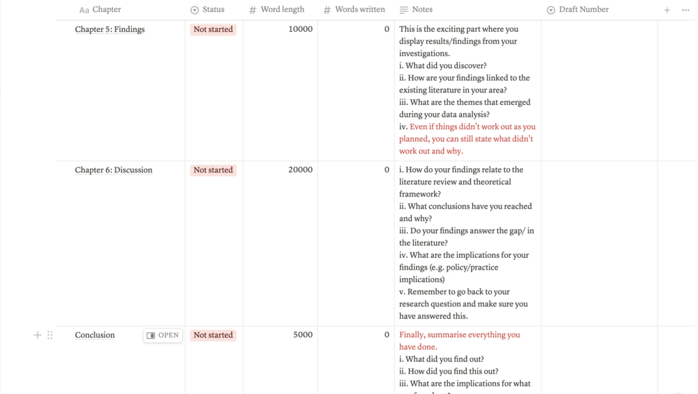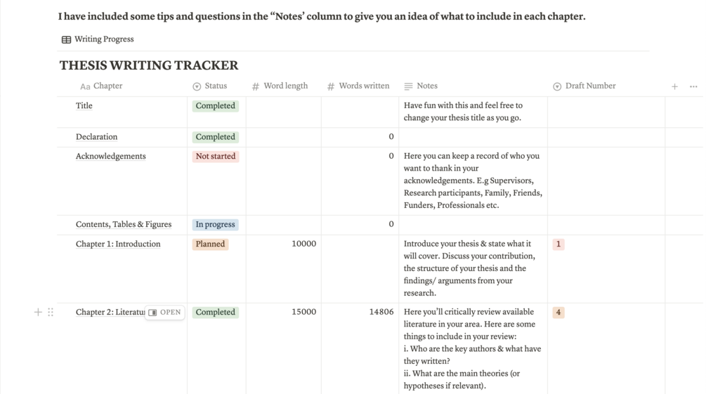 A Notion Template: Simplified PhD Thesis Writing Planner. You can edit this to suit your particular needs.
